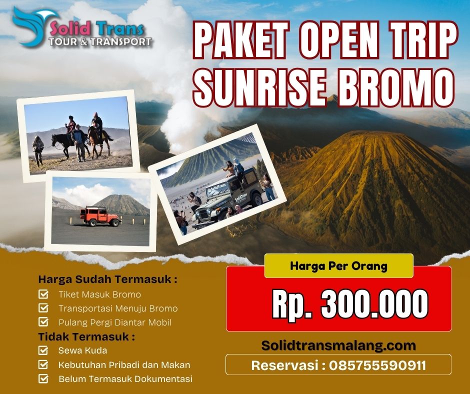 Nah, demikian ulasan mengenai paket wisata Bromo open trip. Pastikan perusahaan yang Anda kontak merupakan perusahaan berpengalaman yang telah turun tangan dalam dunia pariwisata sejak lama, seperti Solid Trans Tour & Transport. Dapatkan paket wisata open trip termurah dengan pelayanan terbaik Anda dengan perusahaan ini. Untuk informasi lebih lanjut tentang fasilitas, harga, maupun pemesanan, Anda dapat mengunjungi web perusahaan di solidtransmalang.com