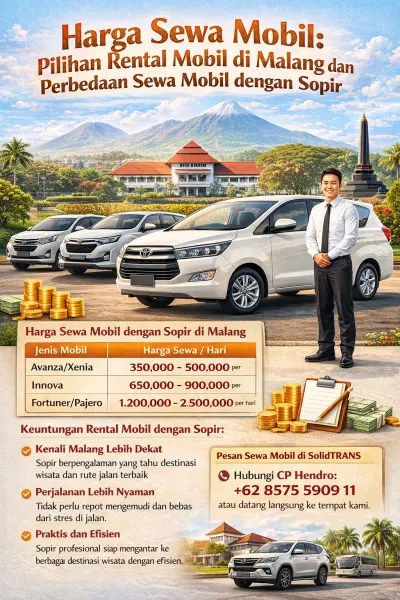 Dengan menggunakan jasa sewa mobil dengan sopir dari SolidTRANS, Anda tidak perlu khawatir tentang persyaratan yang rumit atau proses survei yang membebankan. Cukup hubungi pihak SolidTRANS dan Anda bisa mendapatkan kendaraan yang sesuai dengan kebutuhan, lengkap dengan sopir yang siap mengantar Anda ke berbagai destinasi wisata di Malang dan Batu. Anda hanya perlu menikmati perjalanan, sementara sopir kami akan memastikan perjalanan Anda nyaman dan aman.