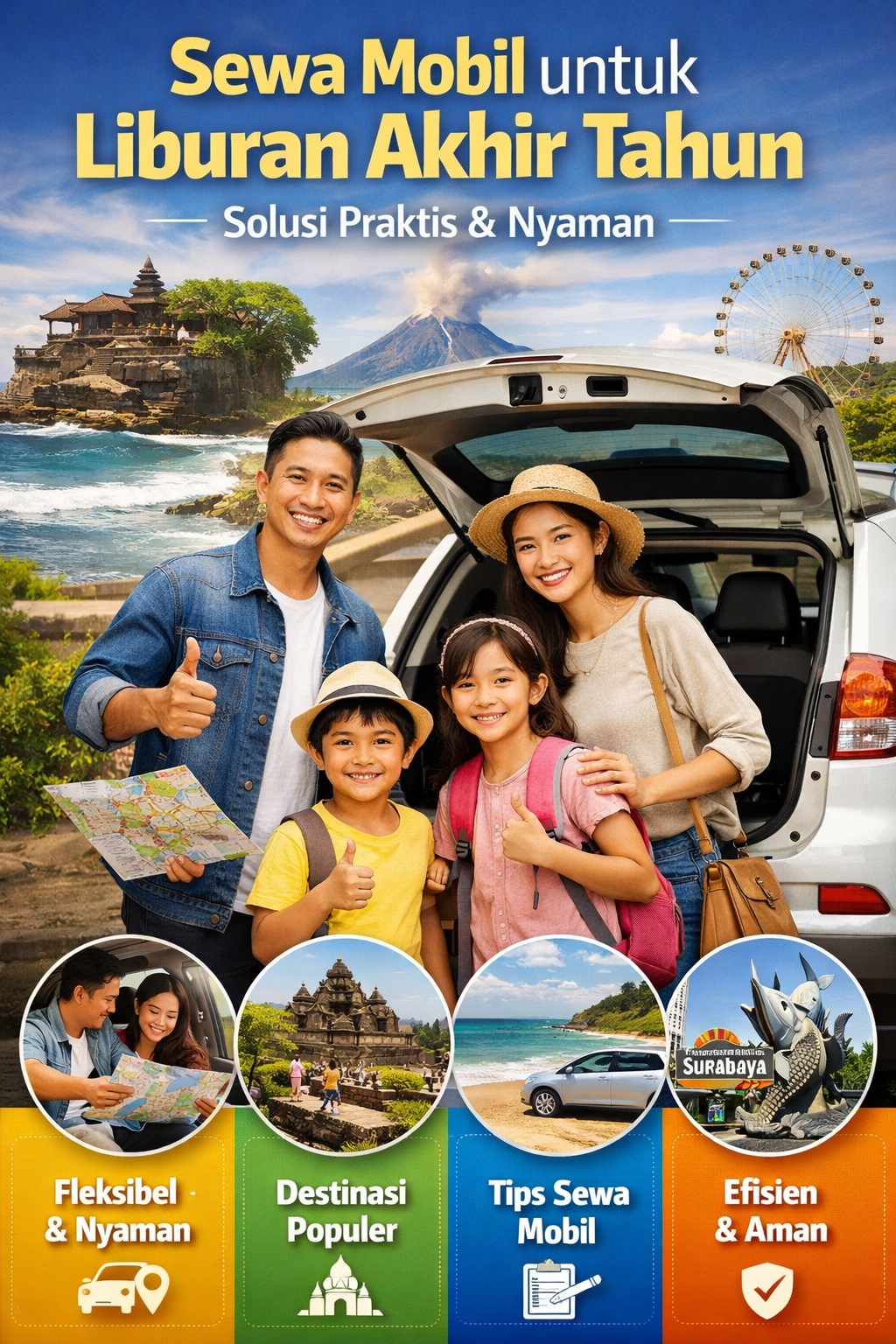 Liburan akhir tahun di Indonesia menawarkan berbagai pilihan destinasi menarik yang bisa dijangkau dengan kendaraan pribadi. Beberapa tempat yang layak dikunjungi dengan mobil sewaan antara lain: